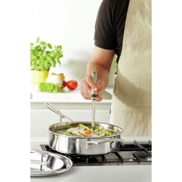 - De gelaste roestvrijstalen steel met gezandstraald oppervlak is extra stevig en blijft lang koel. Door de tegengreep kan je de pan makkelijk hanteren.
