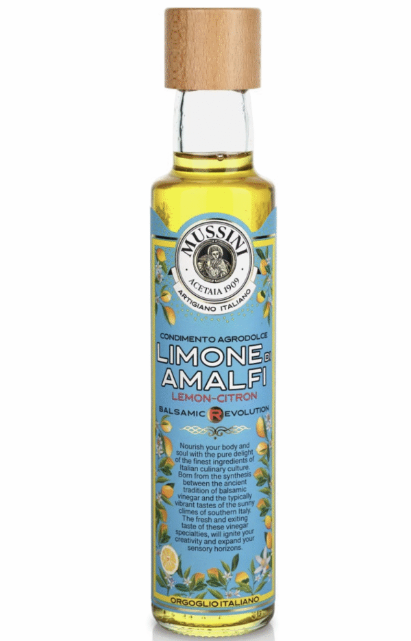 - Mussini – bekend om zijn heerlijke traditionele balsamico’s – combineert balsamico azijn met de frisheid en aromatisch intensiteit van de citroen.